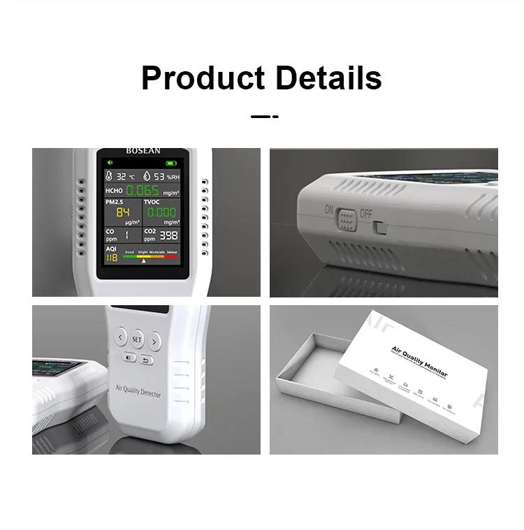 T-Z01: 4 sensores: sensor HCHO, sensor PM2.5, sensor TVOC, sensor de temperatura e umidade. O CO2 e o CO são inferidos a partir dos dados detectados pelo sensor TVOC.