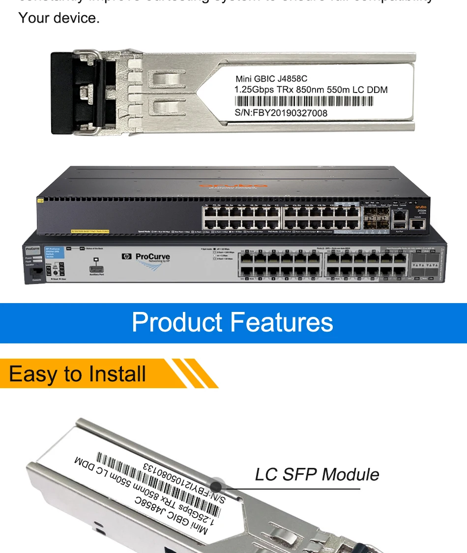 Totalmente compatível com o equipamento de fibra óptica, interruptor de fibra, roteador... Por exemplo: HP ProCurve Série 2910al, HP Série 2530, HP Série 2620, HP Série 2920, HP ProCurve Switch Série 3500yl, JL262A Aruba HPE 2930F Series, Aruba 2930F Series, etc., enquanto disponível de acordo com Seus comentários, Melhorar constantemente o nosso sistema de testes para garantir a compatibilidade total.