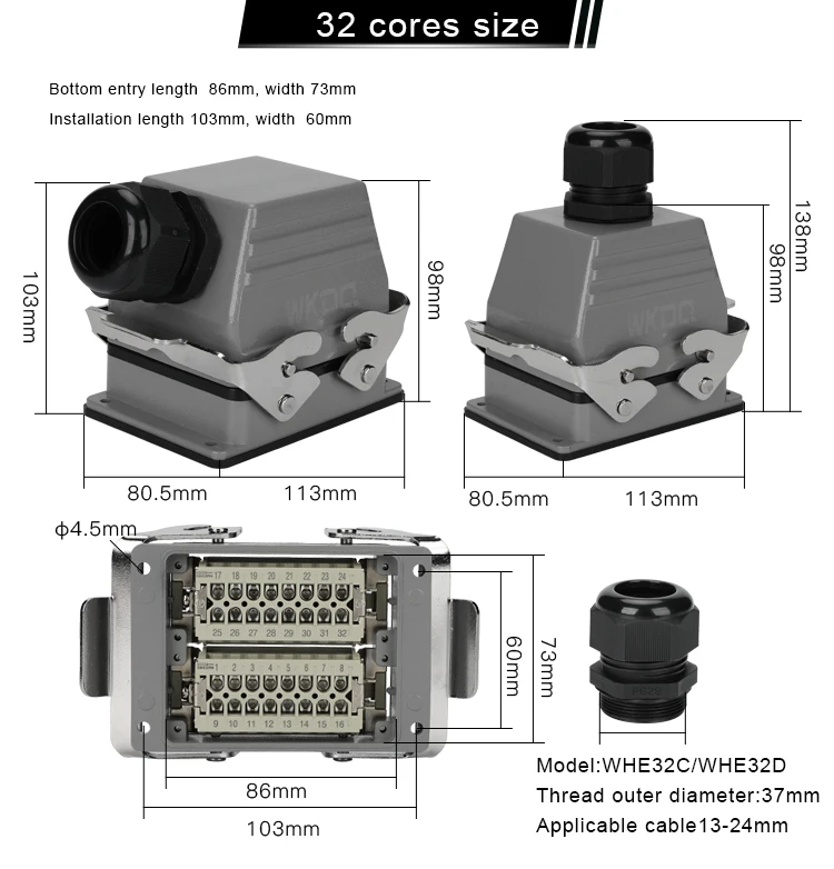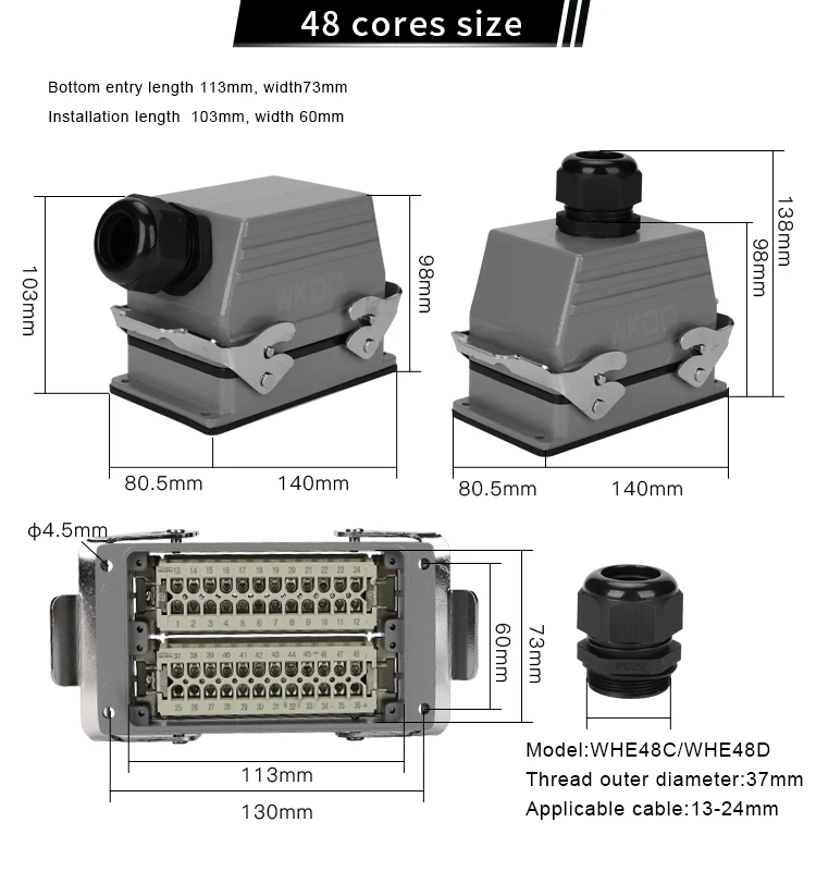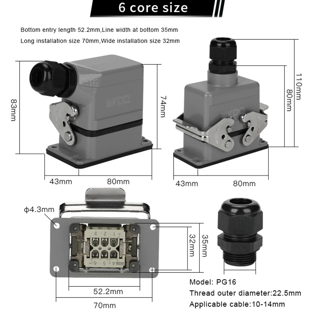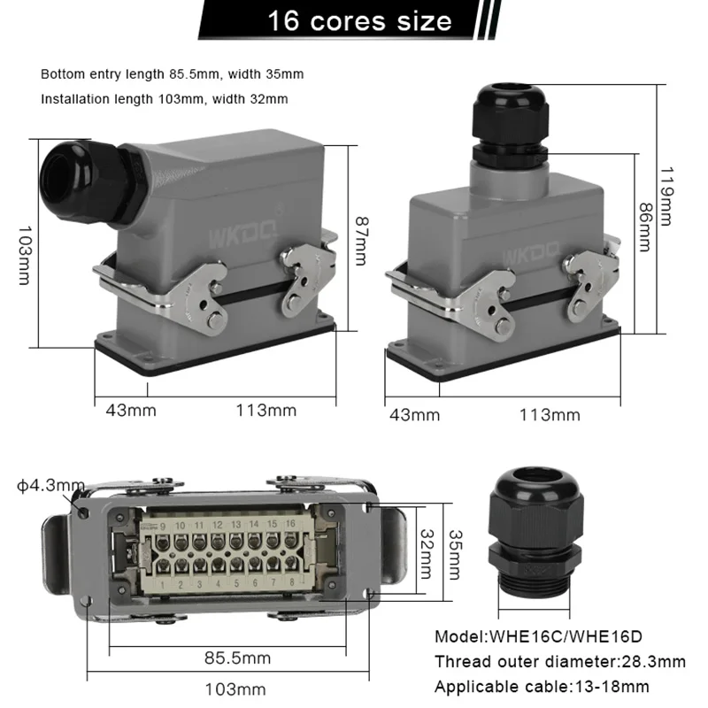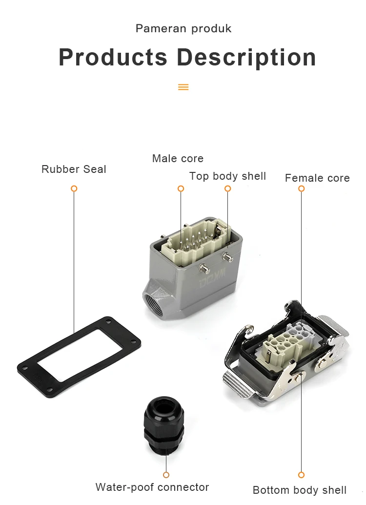 Os conectores de alimentação pesados são ideais para aplicações industriais com requisitos rigorosos. Ele pode ajudar a fornecer uma solução para a ampla gama de necessidades em conectores industriais em engenharia mecânica e de instalações. Trabalhando junto com o conector da entrada do cabo, conveniente usar-se para fornecer um uso e uma salvaguarda fáceis ao equipamento da maquinaria quando o transporte, a instalação, mantêm ou reparam.