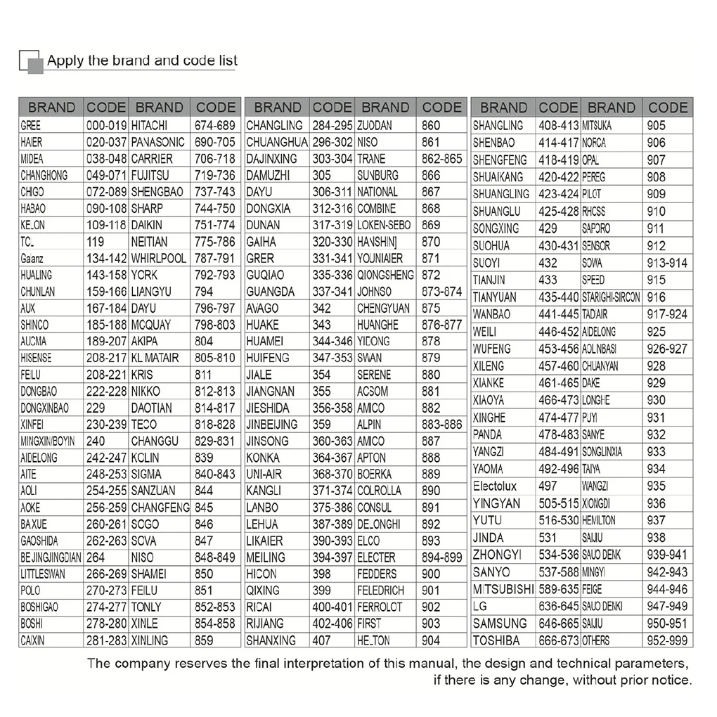 1 * controle remoto universal de ar condicionado (com iluminação e botão OK inferior direito).