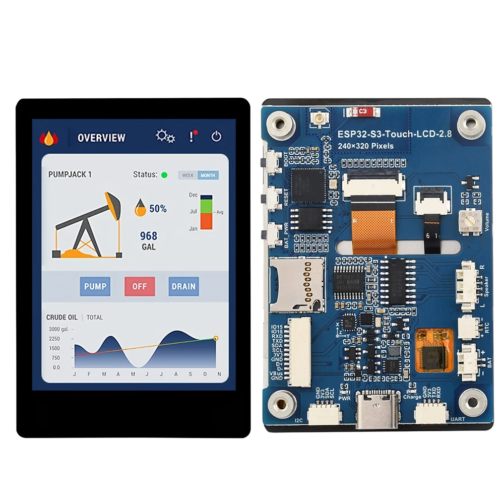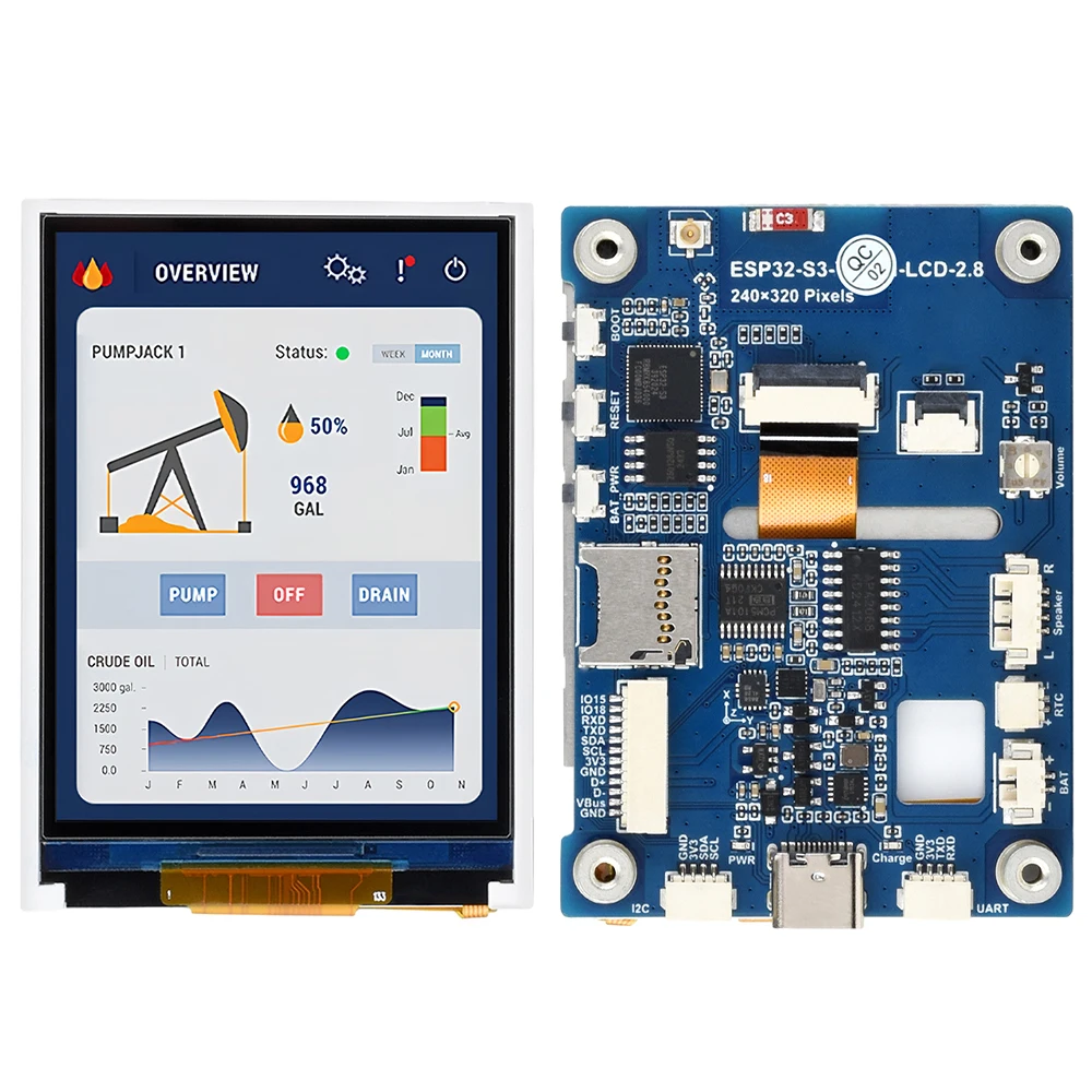 Este produto é uma placa de desenvolvimento de microcontrolador que suporta Wi-Fi de 2,4 GHz e Bluetooth BLE 5.Ele integra Flash e PSRAM de grande capacidade e possui uma tela integrada de 2,8 polegadas (opcional sem versão sensível ao toque/com versão sensível ao toque), que pode executar programas de interface GUI como LVGL sem problemas.Combinado com uma variedade de interfaces periféricas, ele pode desenvolver rapidamente aplicações como HMI do ESP32-S3.