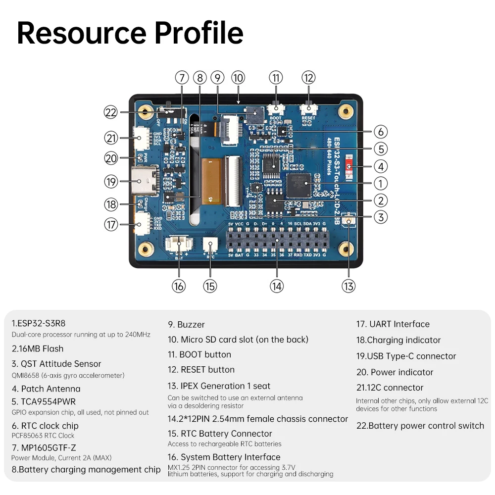 Sensor de seis eixos QMI8658 integrado, sensor de relógio RTC, slot para cartão Micro SD e módulo de gerenciamento de carregamento de bateria, etc.