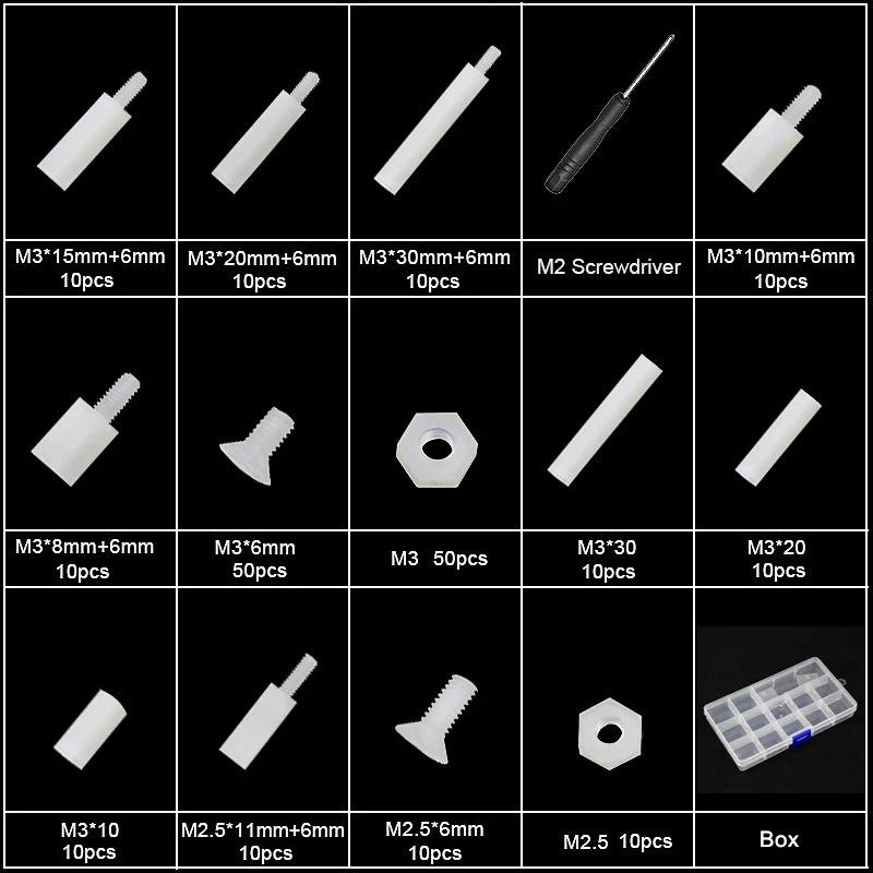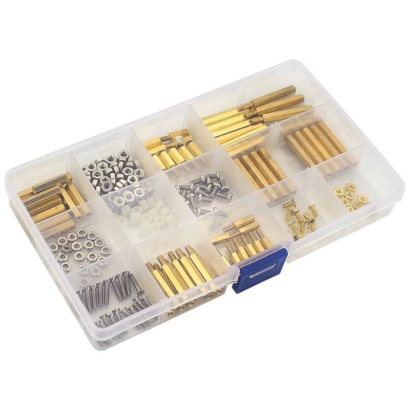Este kit de montagem oferece diferentes tipos de suportes com parafusos e porcas que são mais comumente usados em nossos projetos aqui em DIY.Nós os usamos para montar placas de circuito e ajudar a construir robôs.