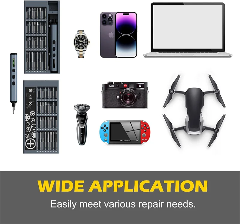 ?Multifuncionalidade?Brocas de precisão versáteis 68 em 1 para soluções abrangentes de reparo.Com 64 bits cobrindo 10 categorias, você terá 64 bits de precisão, como cabeça chata Torx star Phillips, pinça e uma alavanca, oferecendo todas as ferramentas que você precisa em um pacote abrangente.Com luz LED, é fácil de usar mesmo em ambientes de trabalho escuros.