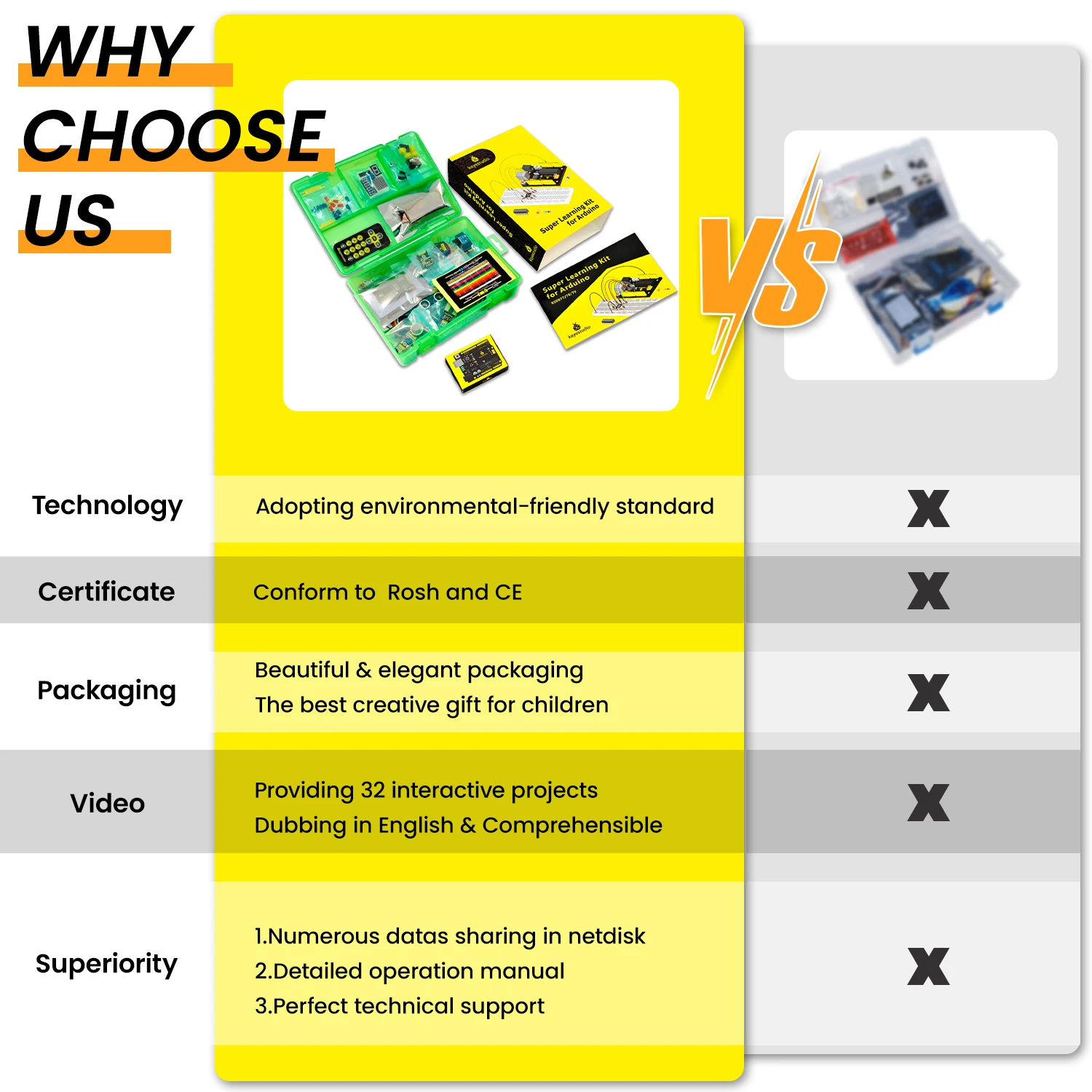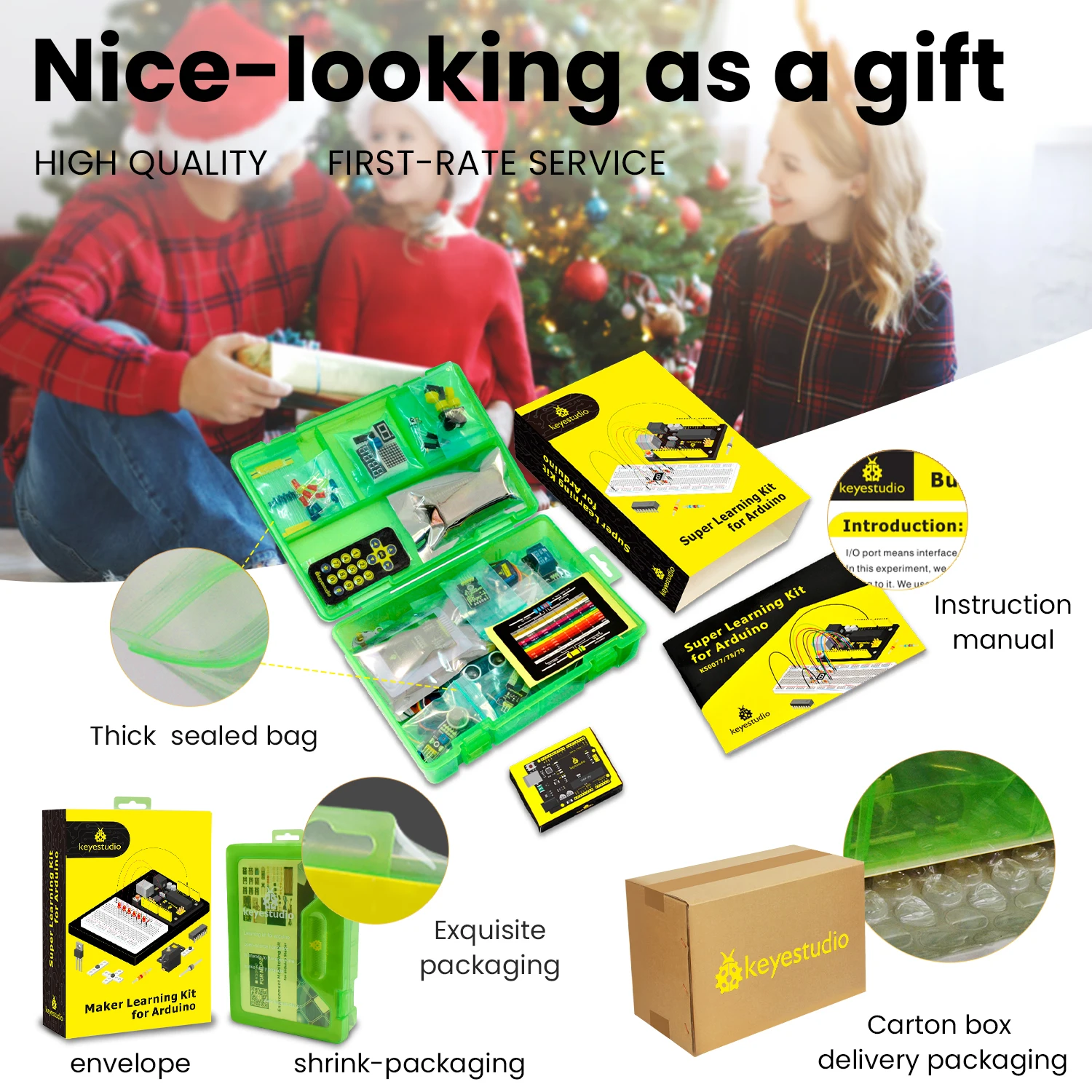 O kit de super aprendizagem Keyestudio é adequado para entusiastas do Aduino. Este kit inclui 32 projetos com tutoriais detalhados, desde o básico até projetos mais complexos. Diferente de outros kits, adiciona alguns módulos funcionais, como RFID, módulo de temperatura e umidade. Existe um diagrama de conexão e um código para cada projeto, facilitando o aprendizado.
