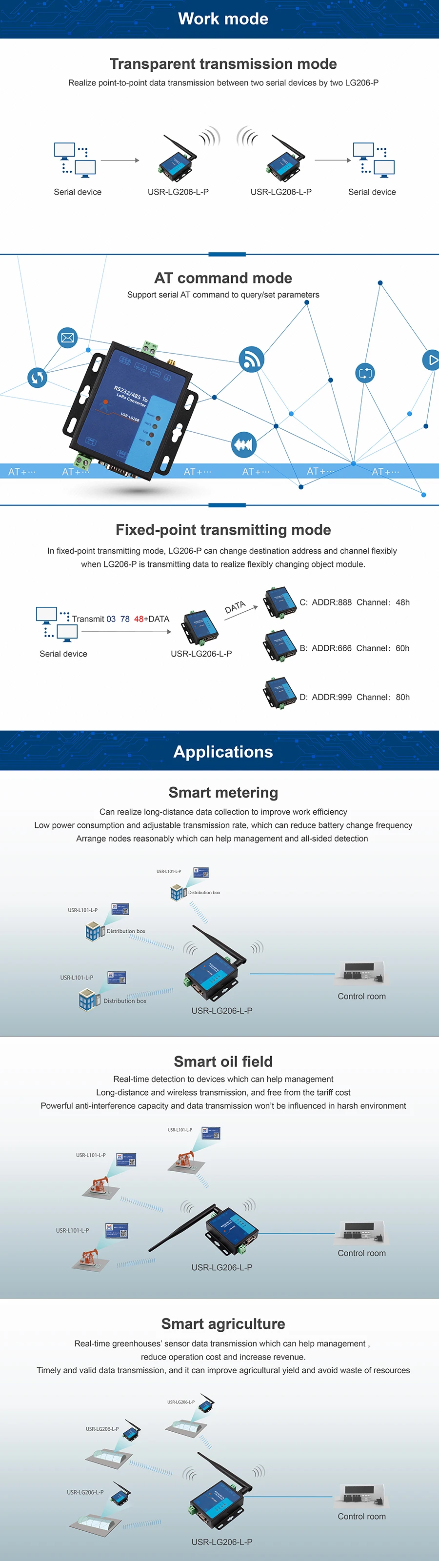 Realize transmissão de dados ponto a ponto entre dois dispositivos seriais por dois LG206-P sem qualquer protocolo de transmissão de dados.