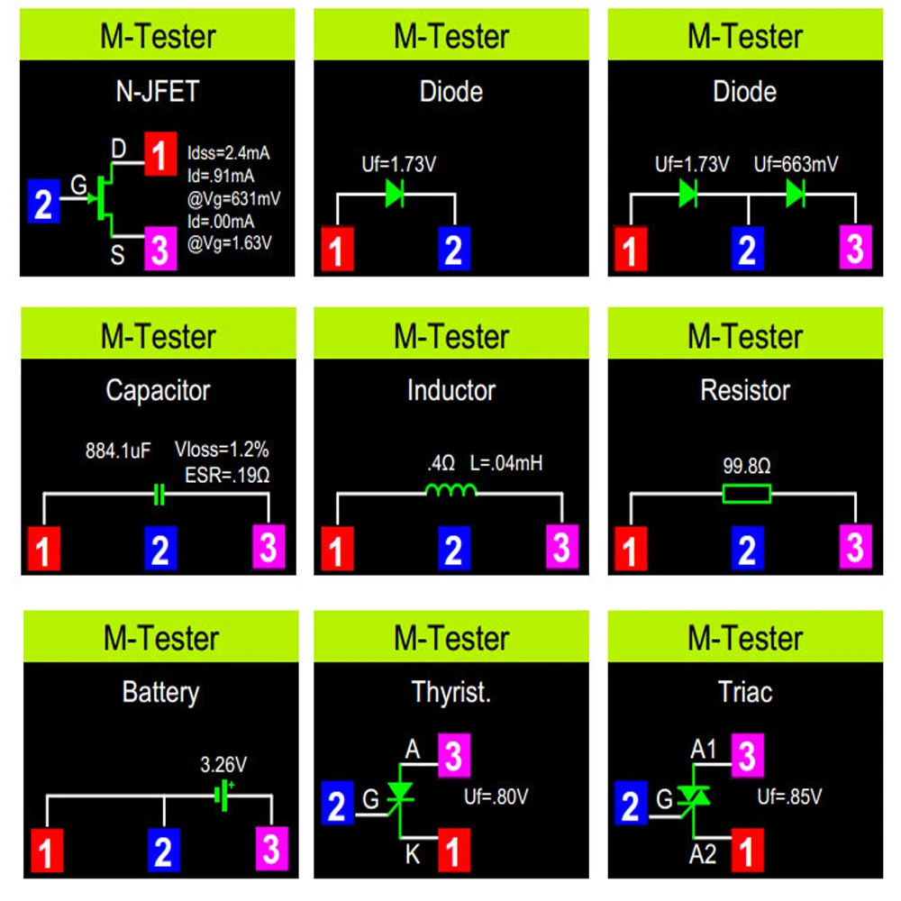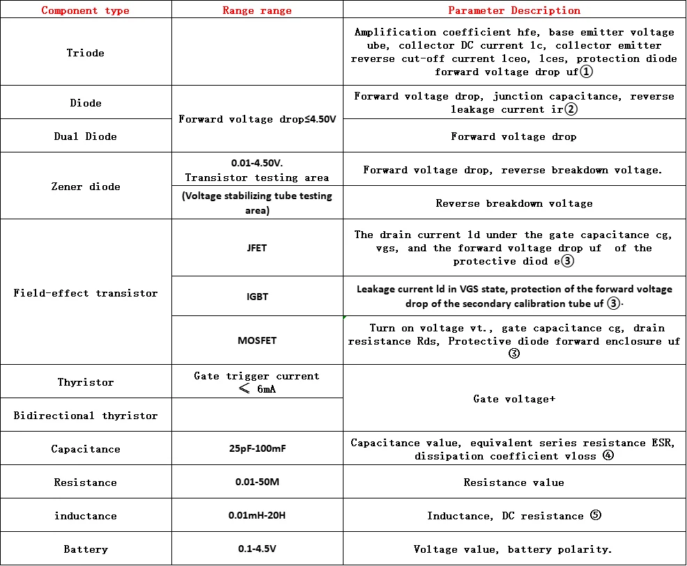 5. A corrente de saída do testador é 6MA/voltagem <5V. IGBTs de alta potência, tiristores e tubos de Darlington que exigem maior corrente/maior tensão podem não ser medidos. Corecoils do ar e indutores do poder não podem diretamente medir a indutância. Recomenda-se tentar sériesconexão. Teste de indutância do anel colorido apropriado, capacitores abaixo de 20PF, recomenda-se testar um capacitor 20PF