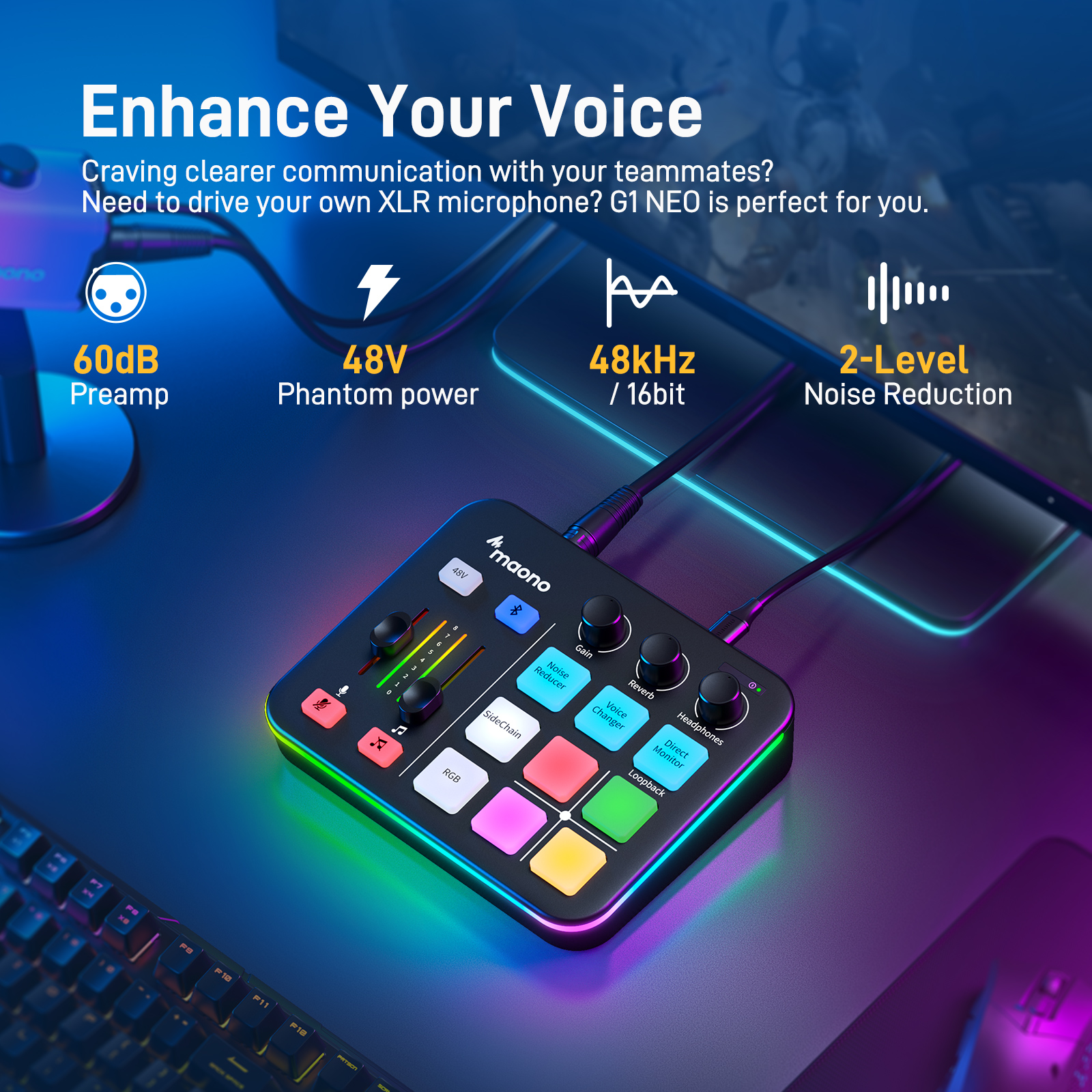 Mixer de áudio para jogos MAONO G1 NEO, streaming RGB de efeitos sonoros personalizados com interface de áudio de microfone XLR, para voz de jogo, Podcast