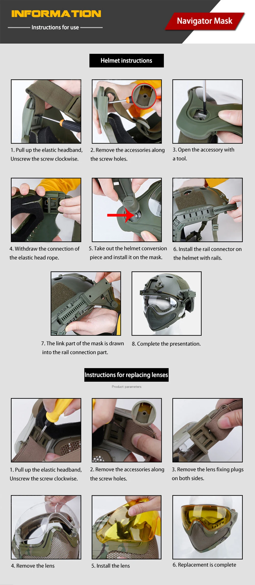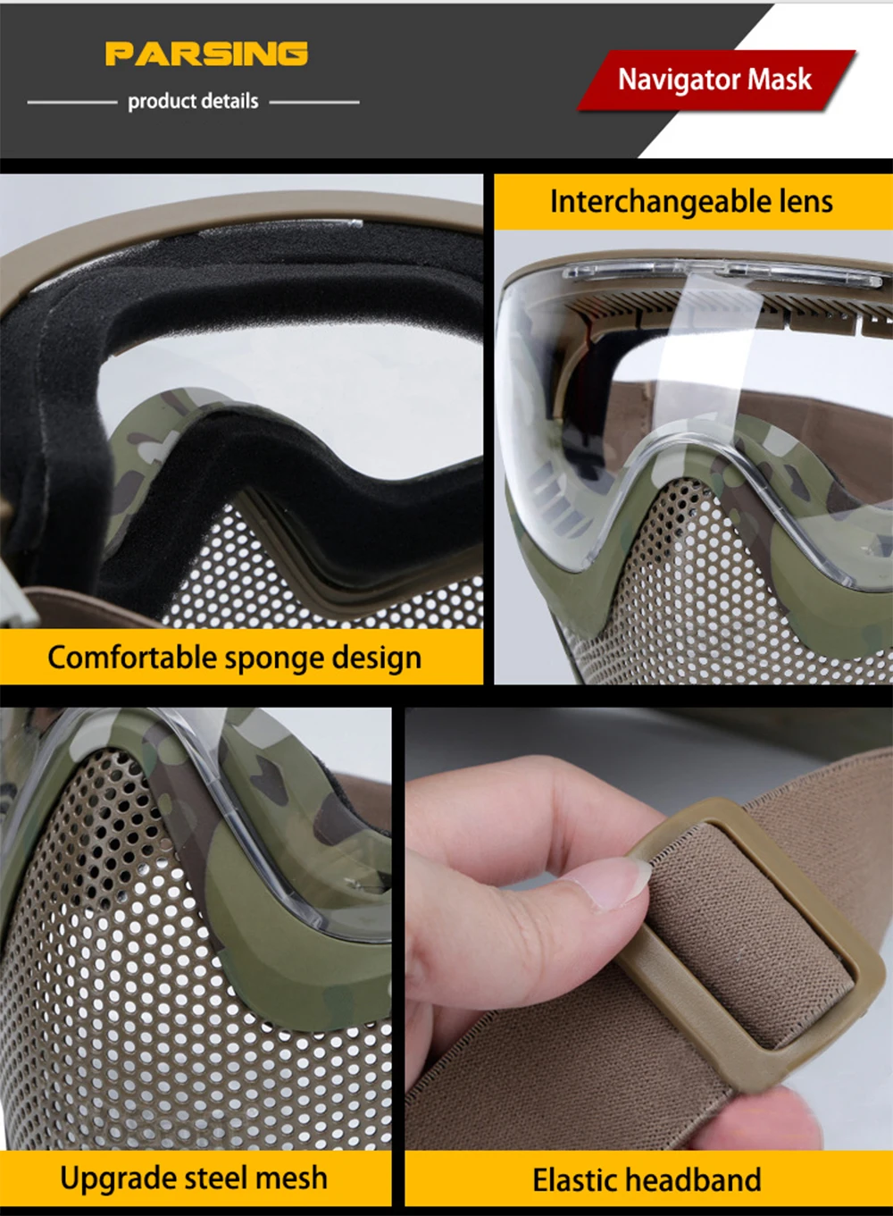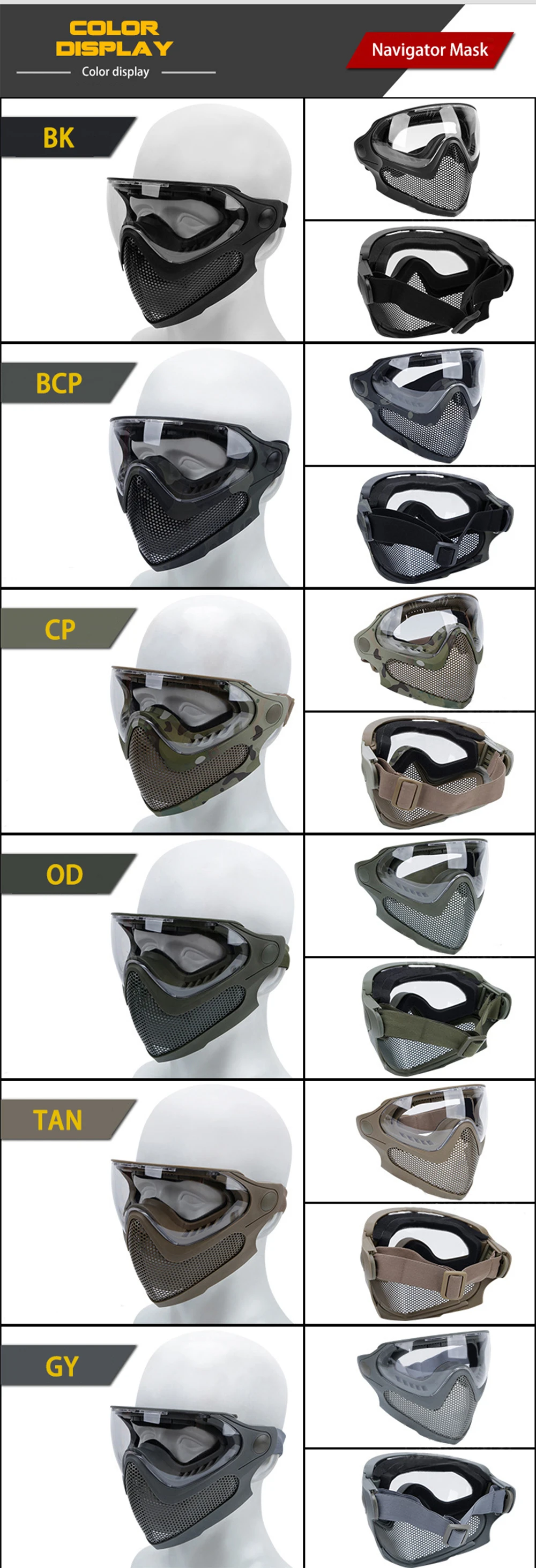 Material: A máscara: TPU; Malha de aço: Nylon; Óculos: Lente de PC