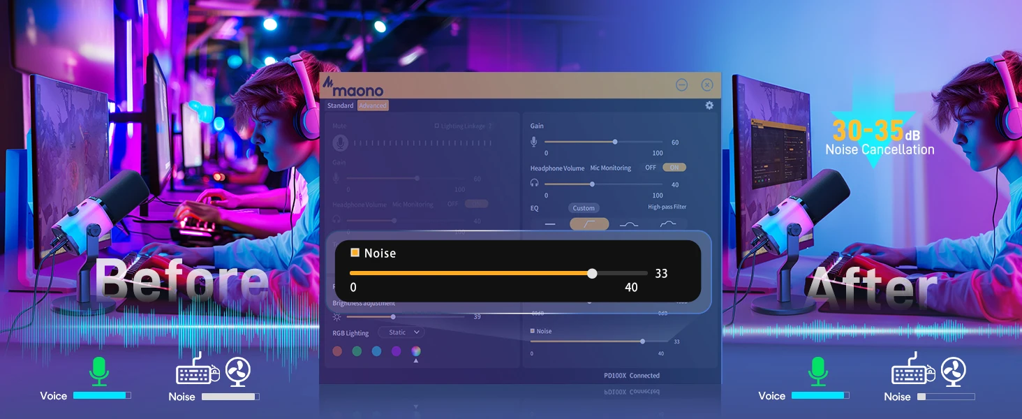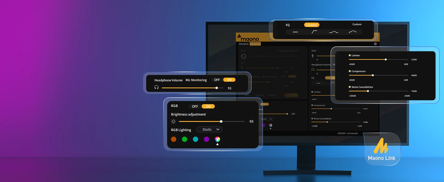 O microfone dinâmico MAONO XLR usa um núcleo de microfone dinâmico personalizado e o mais recente algoritmo desenvolvido para minimizar o impacto do ruído ambiente, alcançando assim o objetivo de redução de ruído. A redução de ruído do software MAONO LINK pode ajustar livremente o nível de redução para se adaptar a vários ambientes de uso, seja você um gamer, streamer ou podcaster. Maono Link adapta sua saída de áudio para uma experiência verdadeiramente envolvente e envolvente. (no modo USB)