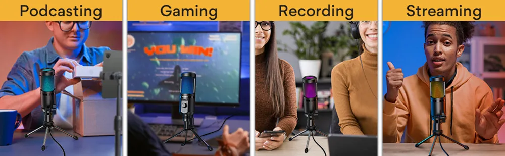 zoom, skype, twitch, voice-over, vídeo do YouTube, etc. Construído para computadores de jogos - Luz RGB ergonômica proporcionando uma nova experiência de jogo.A mudança automática de 7 modos de iluminação RGB faz com que seu microfone pareça sofisticado e legal, o que cria uma atmosfera de jogo personalizada.