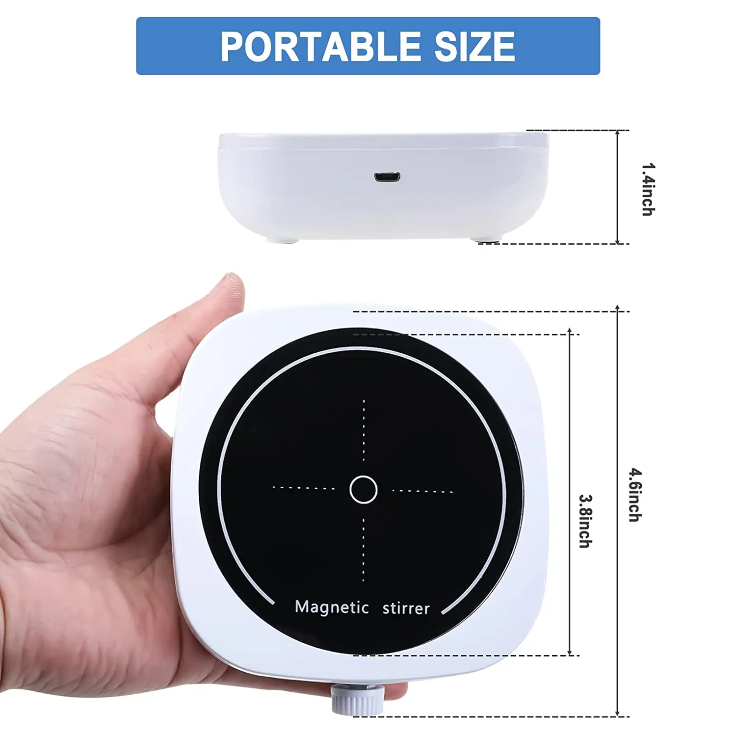 ?TAMANHO PEQUENO, GRANDE CAPACIDADE?A capacidade máxima de agitação do agitador magnético pode atingir até 2L, pesa apenas 460g e o tamanho da máquina: 116mm * 116mm * 35mm (4,6 polegadas * 4,6 polegadas * 1,4 polegadas), tornando-o fácil de transportar e usar.