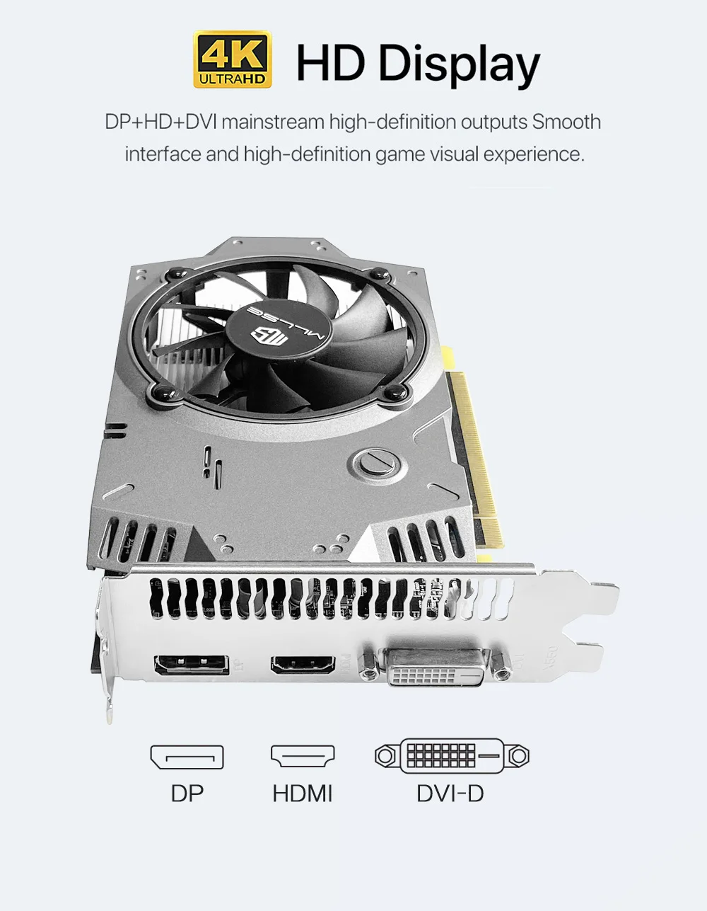 Placa PCB de grande área, usando memória GDDR5 de alta velocidade, acabamento fino, mais estável e durável.4K HD Exibição