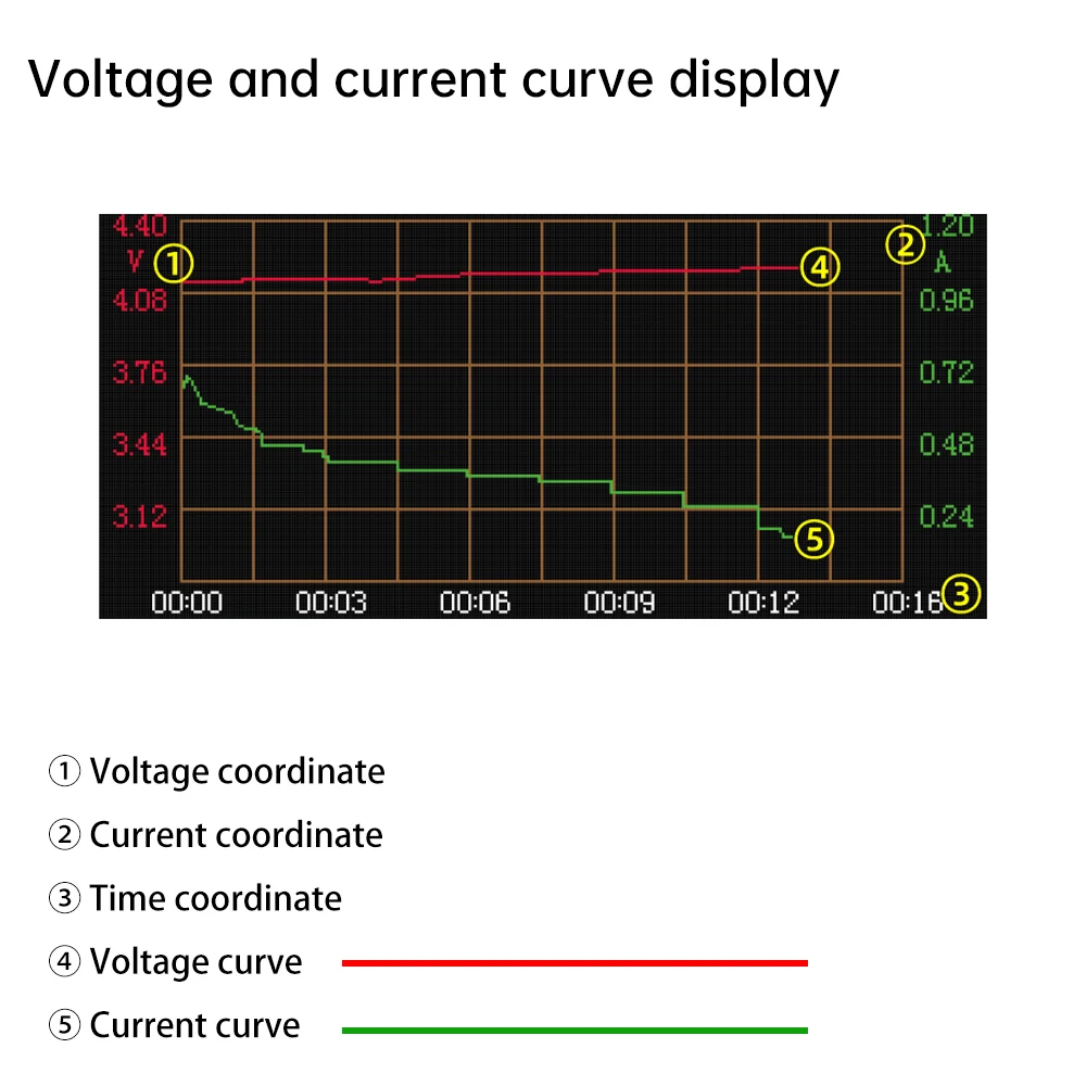 5.Exibição multiparâmetro em tempo real: Exibição em tempo real da tensão da bateria, corrente de trabalho, medição de capacidade e tempo de execução e compreensão abrangente do status da bateria