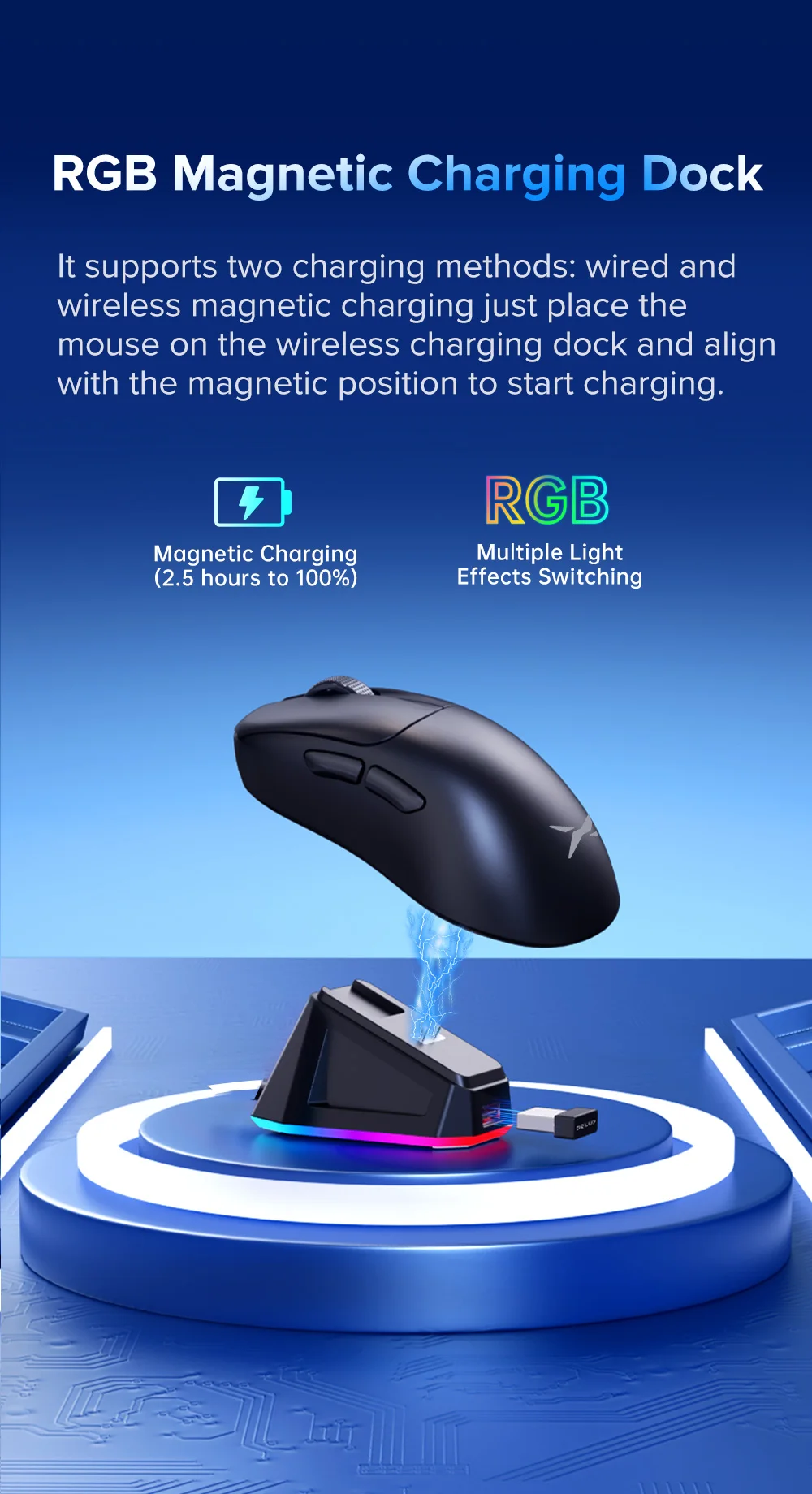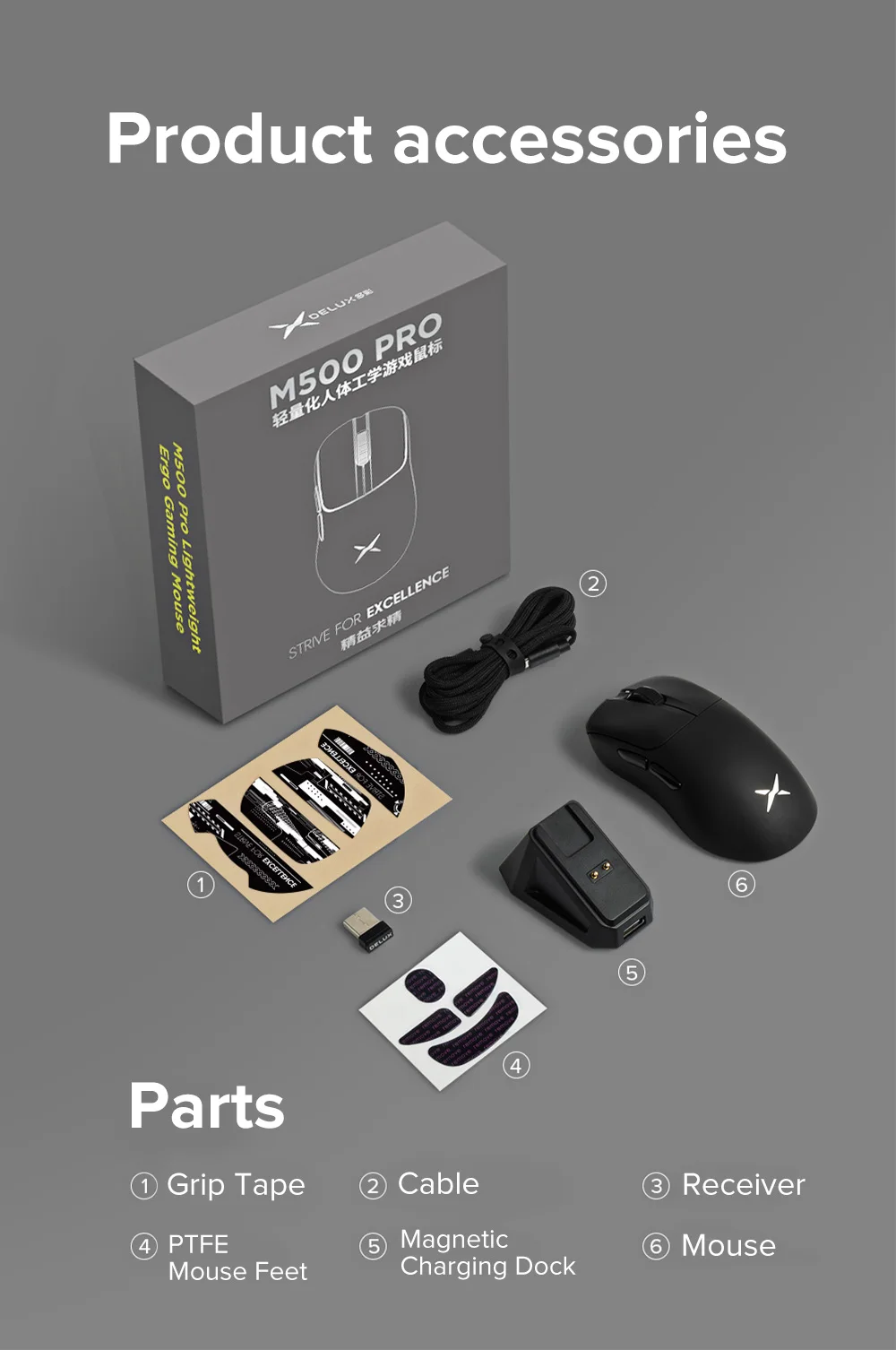 1.Grip Tape; 2.Cable; 3. Receiver; 4. PTFE Mouse Feet; 5. Magnetic Charging Dock 6. Mouse