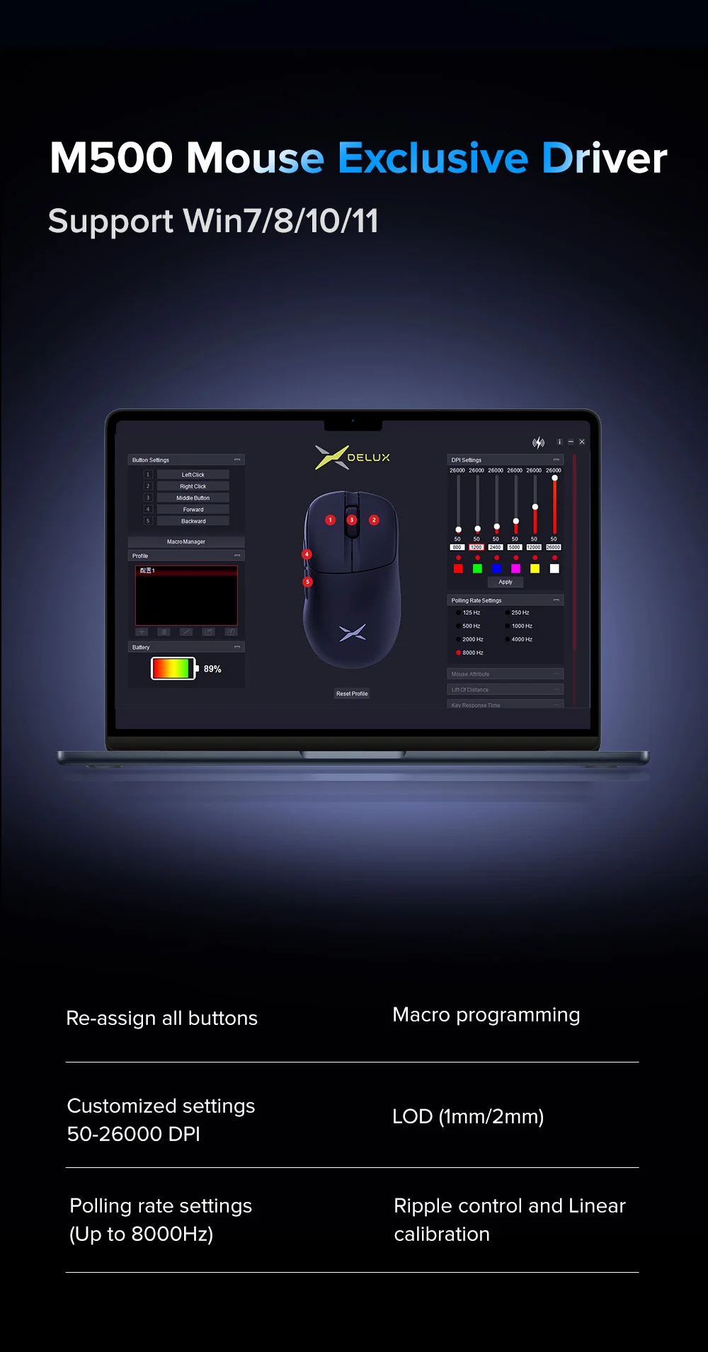 · DPI : 400(red)-800(green)(default) -1200(blue)-1600(purple)-3200(yellow)-5000(white) ; Up to 26000