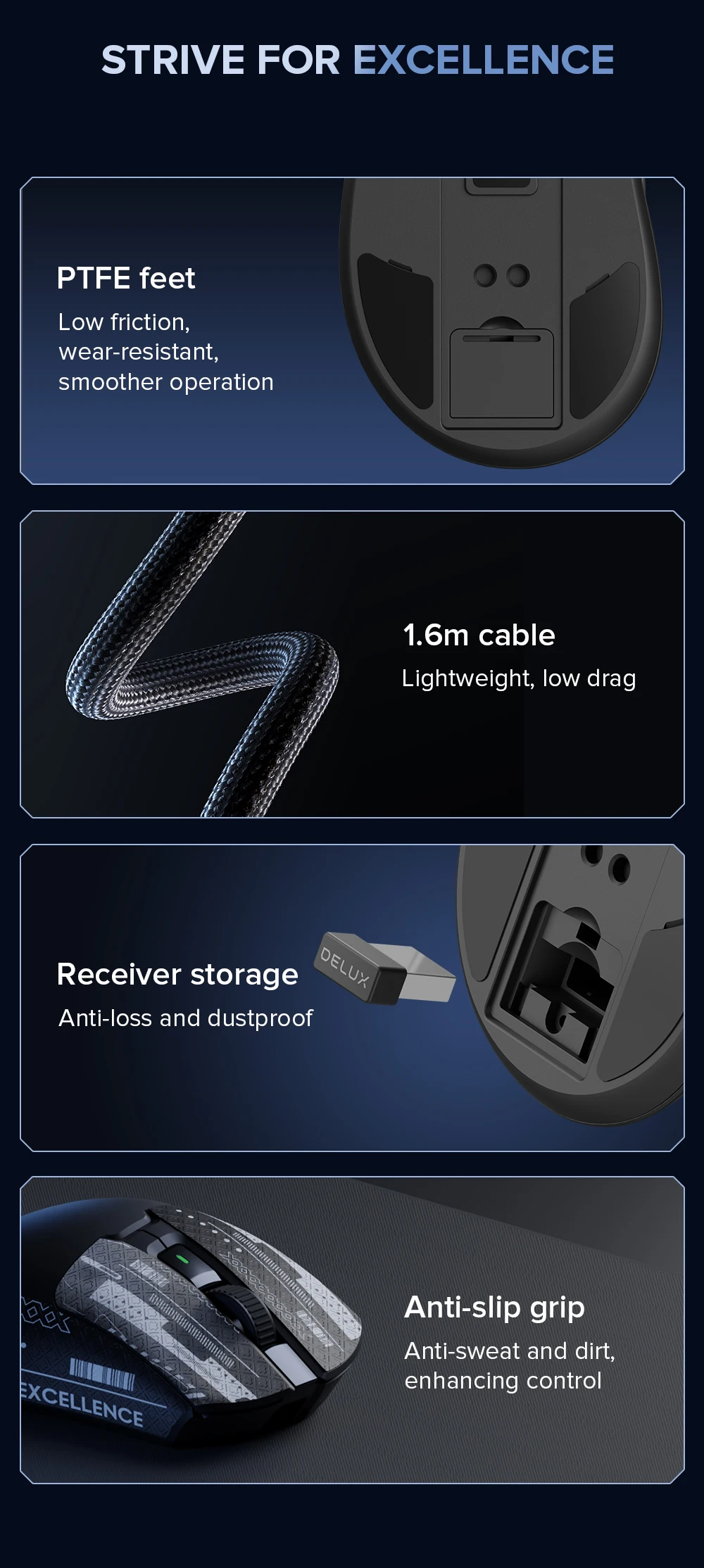 O M900Pro possui uma estrutura interna totalmente otimizada para atingir um ultraleve de 63 gramas, o que faz você experimentar jogos de próximo nível