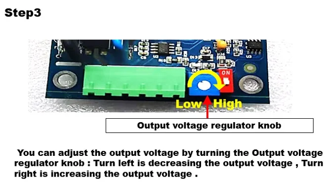 Você pode alterar a tensão de saída continuamente com o protenciômetro na placa-main.