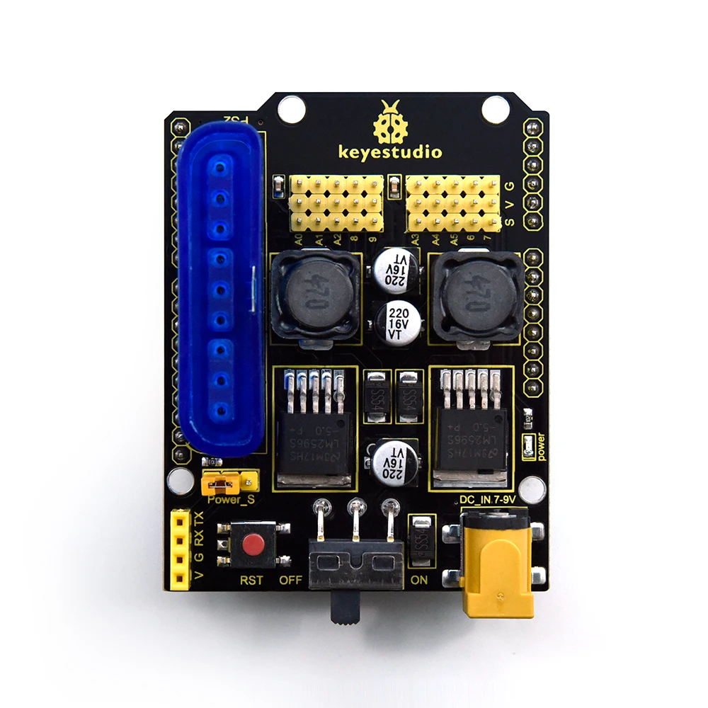 Este é um escudo de driver servo Arduino.Possui uma interface PS2 para usar um controle de alça PS2.Ele contém 10 interfaces IO usadas para conectar servos ou outros sensores.além disso, também ampliamos interfaces RX/TX para interface com módulos de comunicação serial como módulos BT.Existem dois ICs reguladores de tensão LM2596 integrados, que podem fornecer uma corrente estável de 600mA para cada servo. Ele também é aplicado a estruturas mecânicas, como braços robóticos.