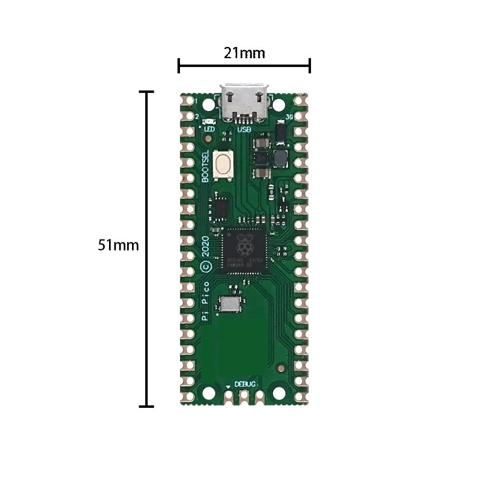 Pico foi projetado para usar cabeçalhos de pinos soldados de 0,1" (é um passo de 0,1" mais largo que um pacote DIP padrão de 40 pinos) ou pode ser usado como um'módulo' montável em superfície, como os pinos IO do usuário também são castellados. Existem pads SMT embaixo do conector USB e do botão BOOTSEL, que permitem que esses sinais sejam acessados se usados como um módulo SMT soldado por refluxo.