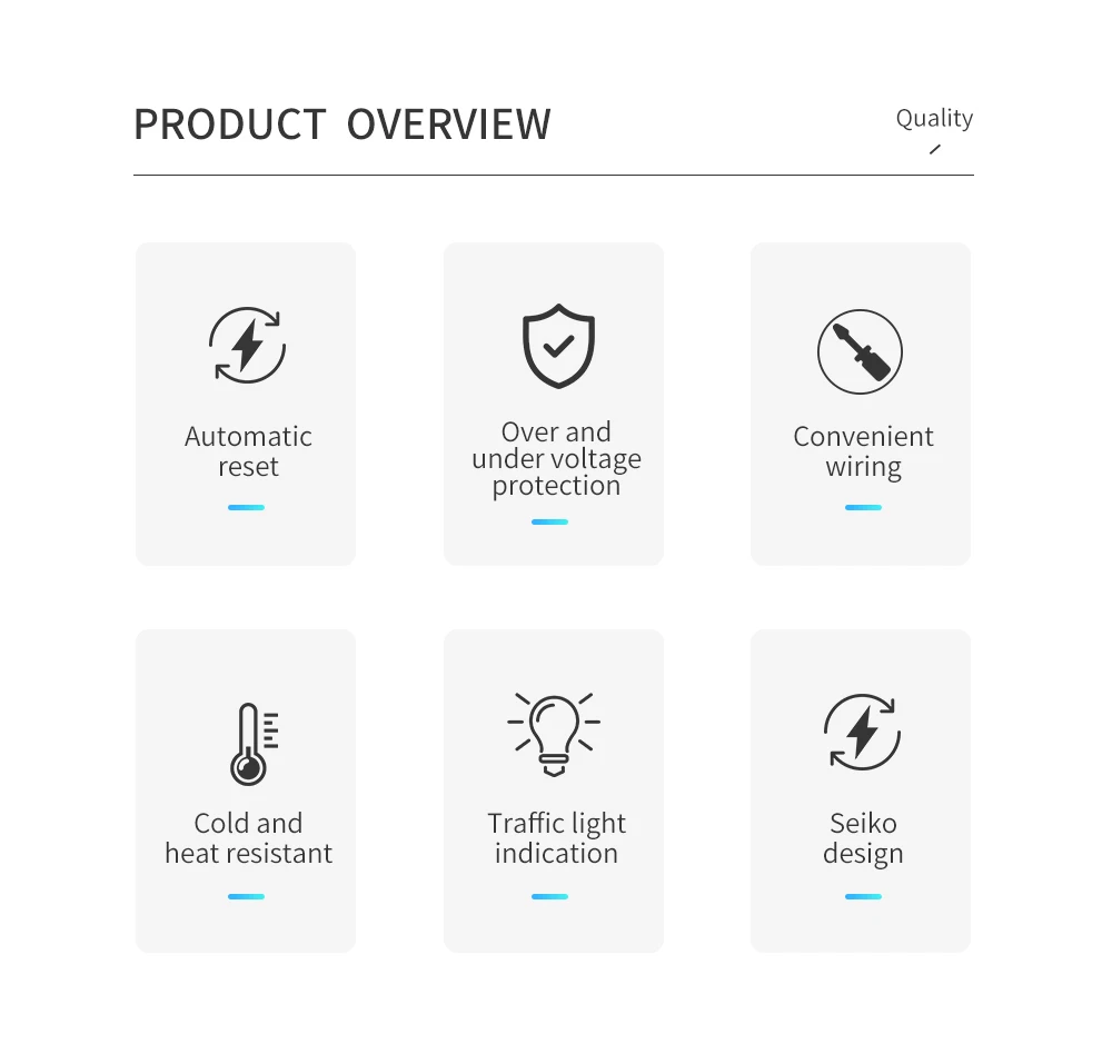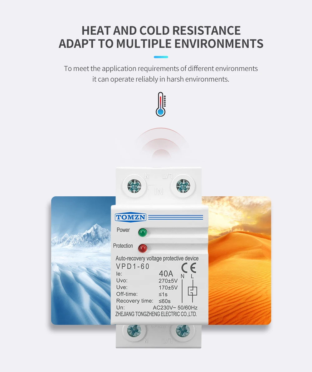 O dispositivo de proteção contra sobretensão e subtensão de recuperação automática está em conformidade com os padrões de design modular.as placas de circuito dos produtos adotam componentes eletrônicos de boa qualidade com desempenho confiável.quando a situação de energia é instável.Sua função de proteção será ativada automaticamente.uma vez que a tensão exceder a gama limitada de produtos, ela será cortada automaticamente para proteger a segurança de equipamentos elétricos e pessoas.O dispositivo será reabastecido em 1 minuto, quando a energia retornar ao normal.