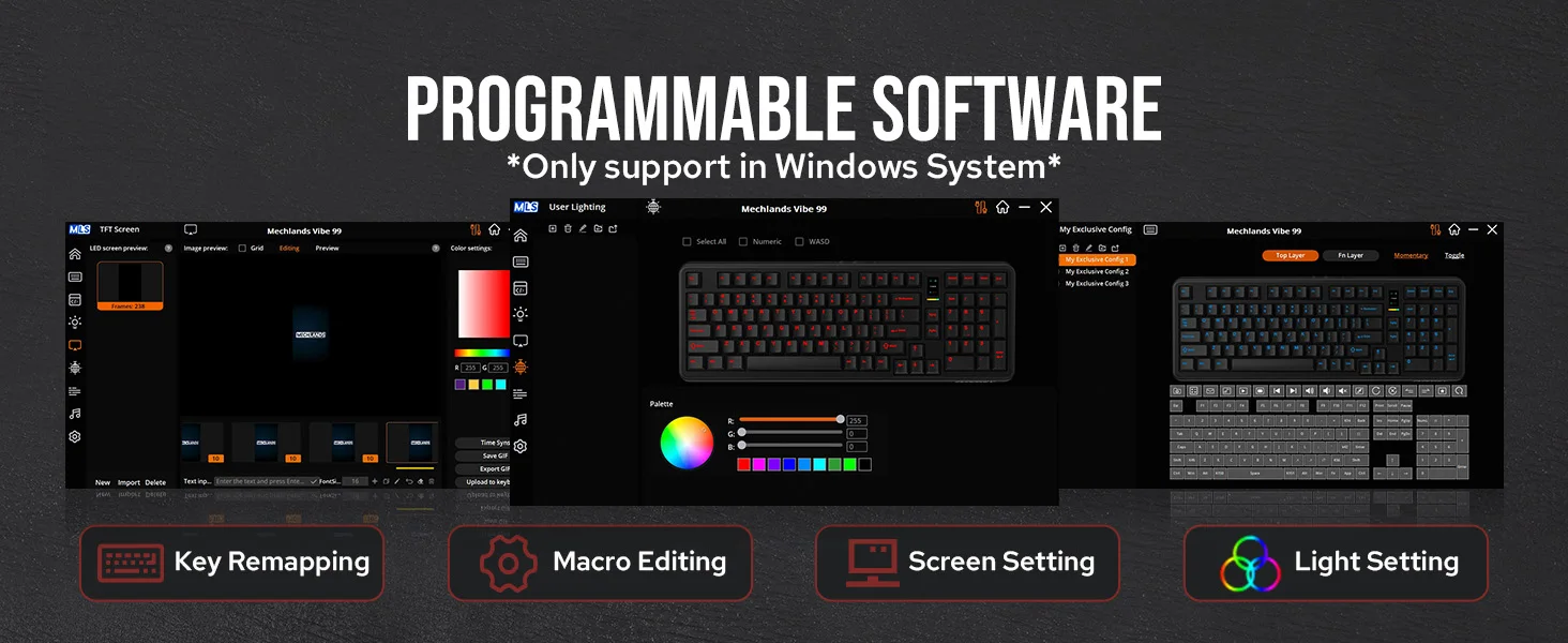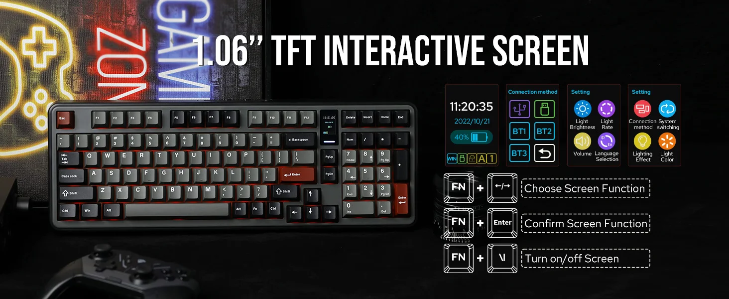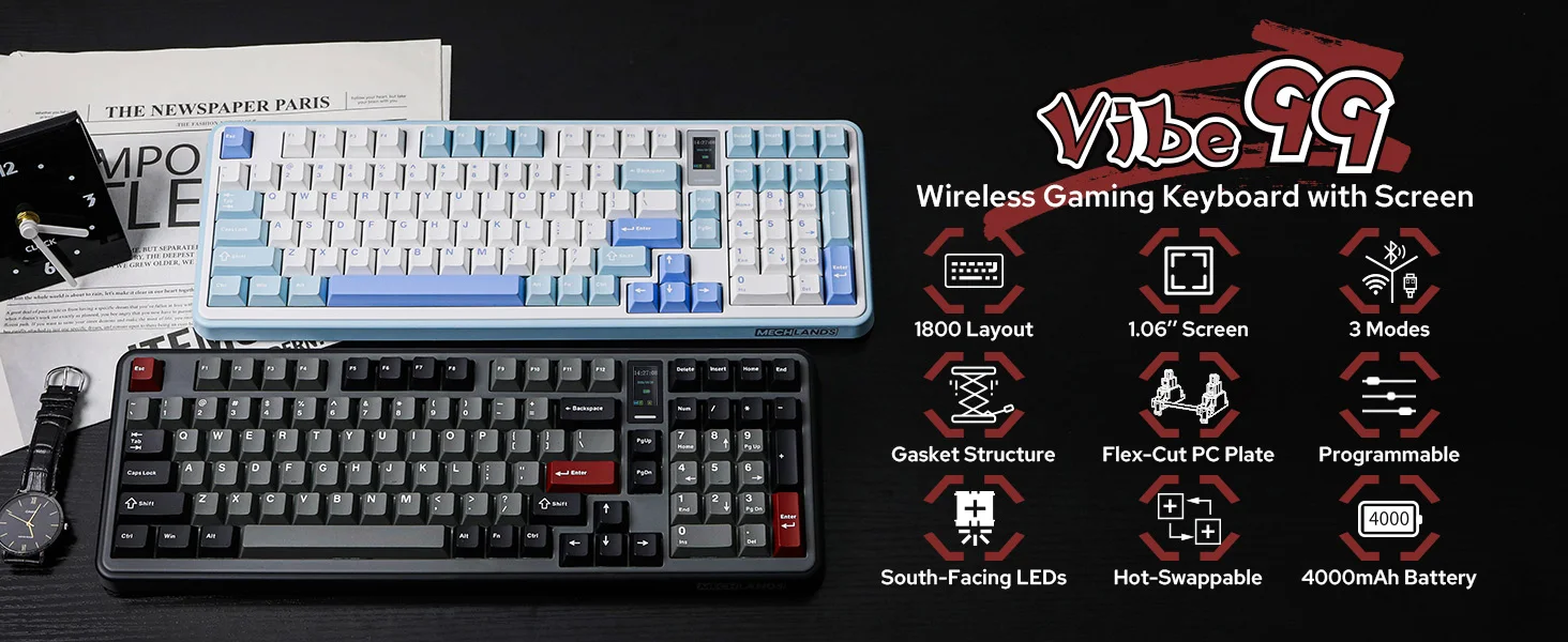 MechLands Vibe99 1800 Layout Teclado mecânico sem fio com fio/Bluetooth/2,4 GHz com tela TFT de 1,06 polegadas