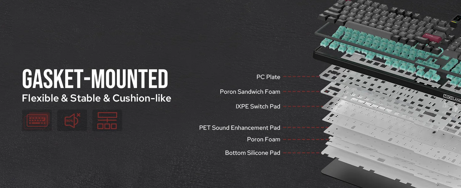 Experimente um conforto de digitação superior com a estrutura montada na junta do Vibe9.Este design oferece um feedback macio e almofadado, aprimorado por cinco camadas de acolchoamento interno, incluindo espuma Sandwich PORON, uma almofada de interruptor IXPE, filme PET, espuma Poron PCB e uma almofada de silicone inferior.Essas camadas trabalham juntas para proporcionar uma sensação de digitação luxuosa e acústica satisfatória e profunda, garantindo uma experiência de digitação encantadora com cada pressionamento de tecla.