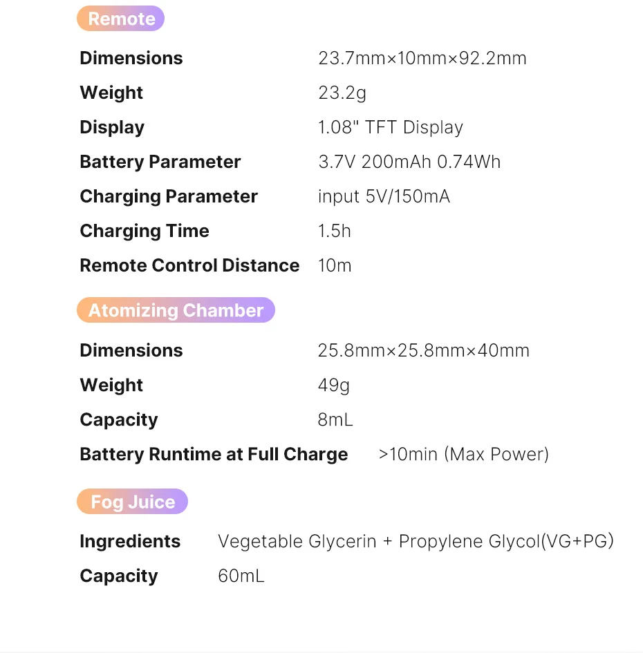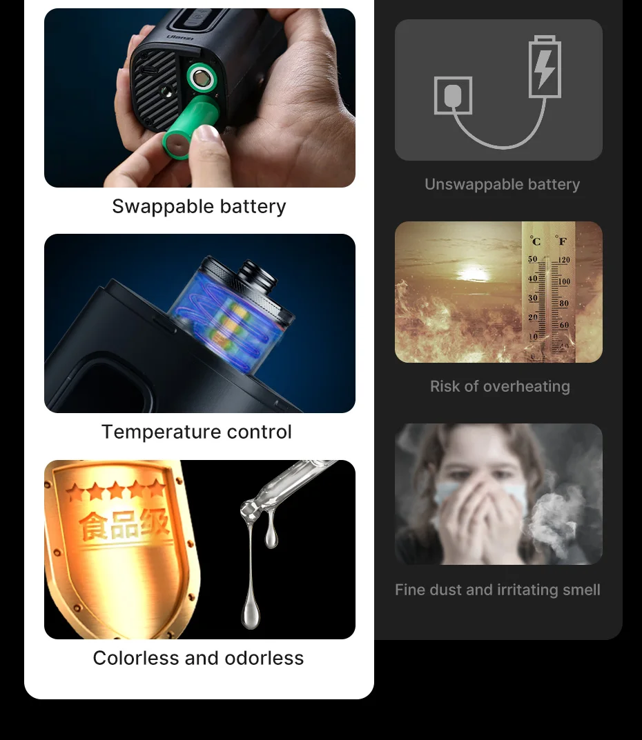 7. Segurança sem preocupações: O controle de temperatura evita o superaquecimento; A glicerina vegetal garante um spray nebuloso sem poeira fina e é livre de odores.