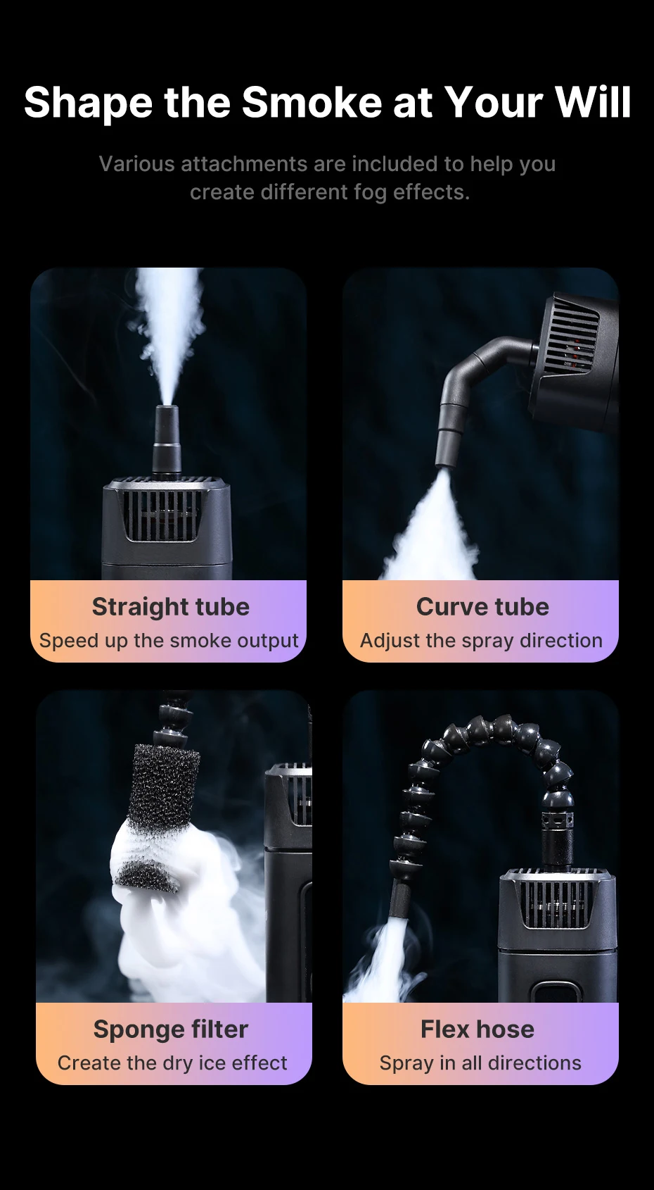 3. Molde a fumaça à sua vontade: vários acessórios estão incluídos para ajudá-lo a criar diferentes efeitos de neblina.