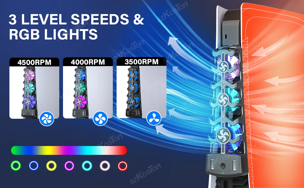 ?Ventilador mais frio para PS5 com luzes LED maravilhosas?O ventilador possui um indicador de vento que mostra claramente o nível do vento: verde significa baixa velocidade, azul significa velocidade média, vermelho significa alta velocidade.E o ventilador de resfriamento para ps5 exibirá luz de respiração COLORIDA aleatoriamente durante o trabalho, o que criará uma atmosfera de jogo legal e tornará a aparência do seu console mais esplêndida e proporcionará uma experiência de jogo diferente.Nota: a luz respiratória não pode ser desligada individualmente.Szkoston